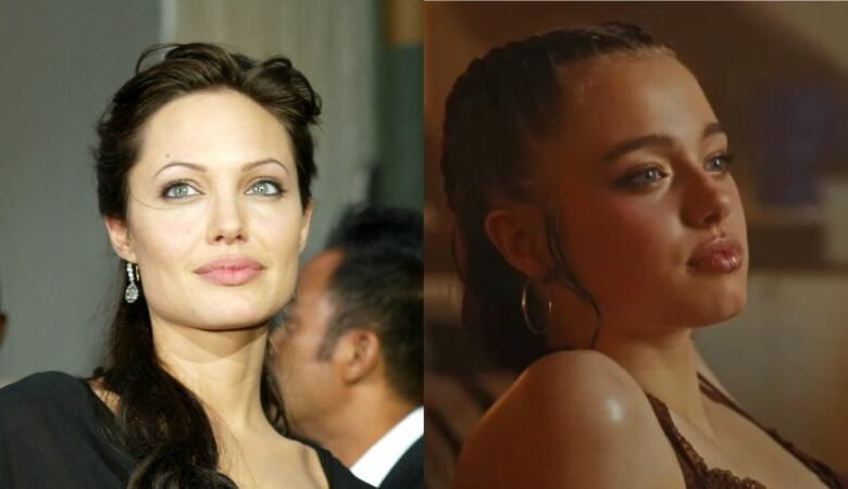 While many have noted the striking resemblance between the mother and daughter, Jolie-Pitt’s music video appearance amplifies this resemblance to an unprecedented level. The stylist put her blonde hair up in a tight braided bun, and the makeup artists gave her a smoky eye from the early 2000s, gold contour, and pink blush. This outfit, with its glossy lip, pulled-back hair, and lacy black tank top, made Jolie-Pitt look like she did when she played Lara Croft.
