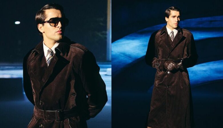 Demir picked a color scheme that was earthy to go with the winter mood. The Burberry brown satin coat was the main piece of the outfit. The coat was midi-length and tie-cinched at the waist with a belt, which made the shape clean and classic. His underwear was a white shirt with a patterned tie that was also from Burberry. This piece kept the theme steady and classy.