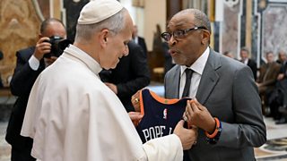 Lee handed the Chicago-born Pope a New York Knicks shirt printed with the number 14 and the words Pope Leo.